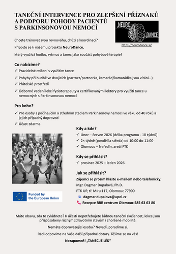 Mgr. Dagmar Dupalová představila projekt Neurodance vedený katedrou FTK UP Olomouc. Projekt zkoumá vliv tance na nemocné Parkinsonovu nemocí. Pozitivní vliv na jejich fyzickou stránku, krátkodobou paměť a celkovou duševní pohodu.